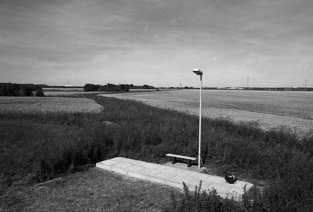 Uden titel (kantsten, fortovsfliser, brosten, cement, grus, træ, maling, lygtepæl).